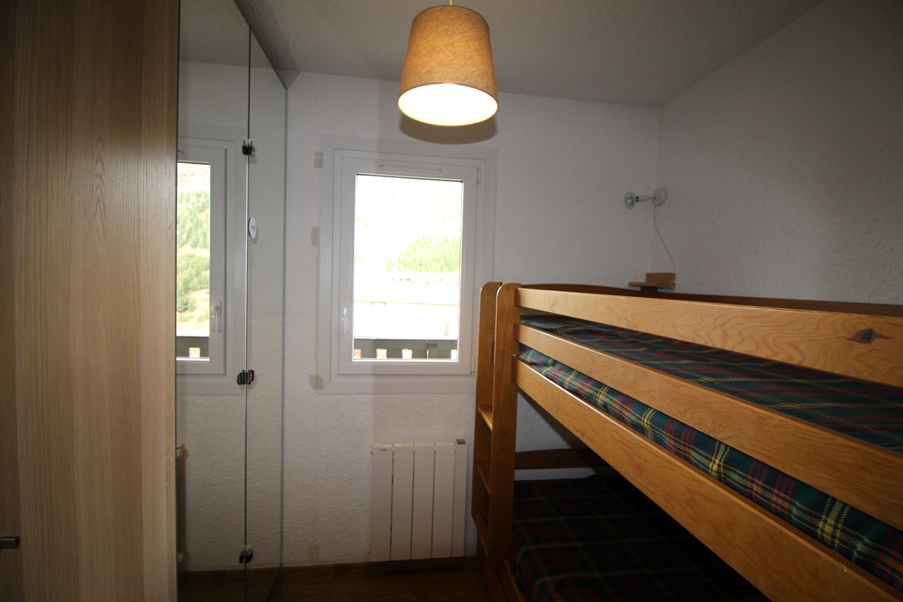 Il est composé d'un séjour avec un canapé, d'un coin cuisine équipé, d'un coin cabine dans le couloir de l'entrée avec lit superposé (2 lits 1 personne), d'une chambre avec un lit superposé (2 lits 1 personne), d'une chambre avec un lit double, d'une salle d'eau avec douche et des WC séparés .Appartement classé meublé de tourisme 3 étoiles