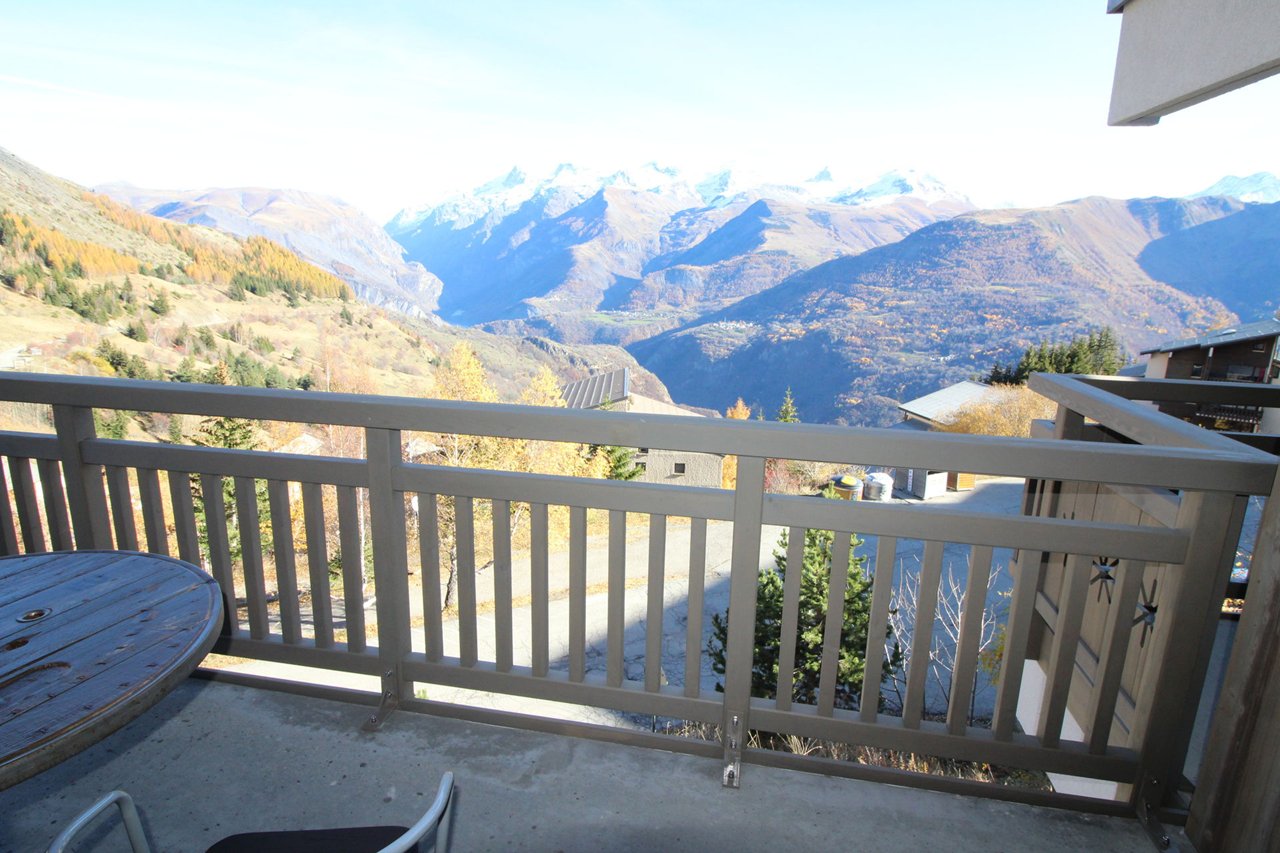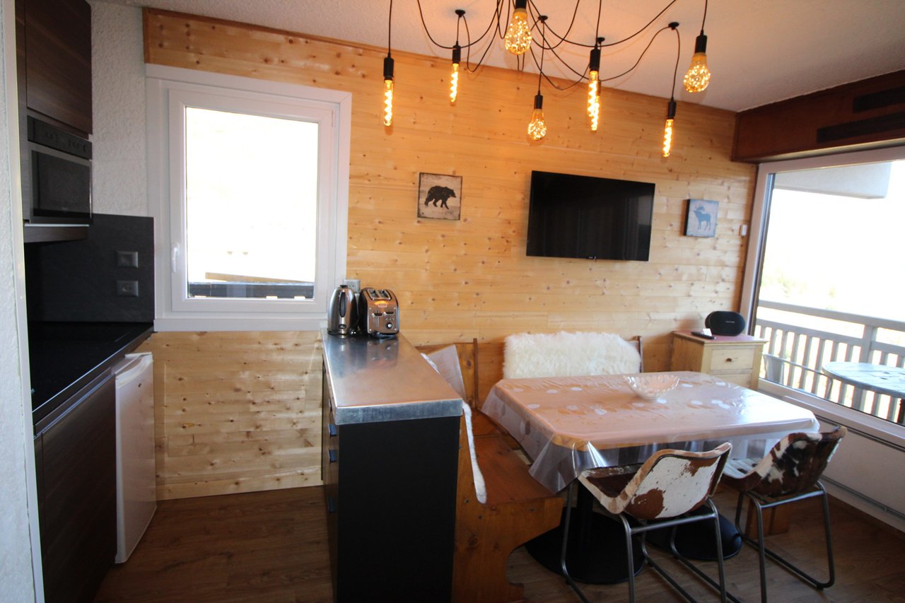 Magnifique appartement entièrement rénové. Son balcon offre une jolie vue dégagée sur les montagnes et les pistes de ski.